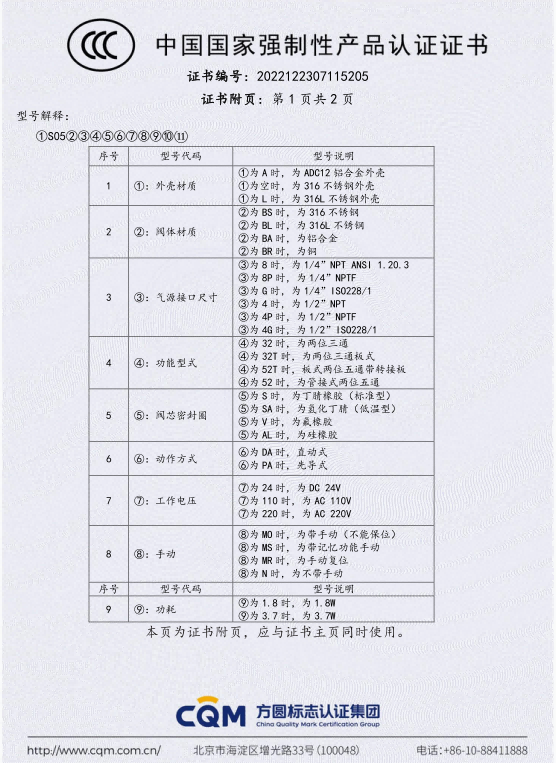 S05系列电磁阀CCC证书